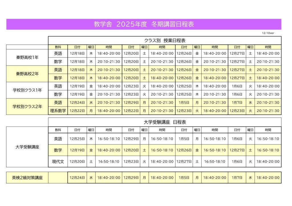 教学舎では、2学期の通常授業を12月13日(土)で終了し、12月18日(木)~1月7日(水)までが『冬期講習期間』となります