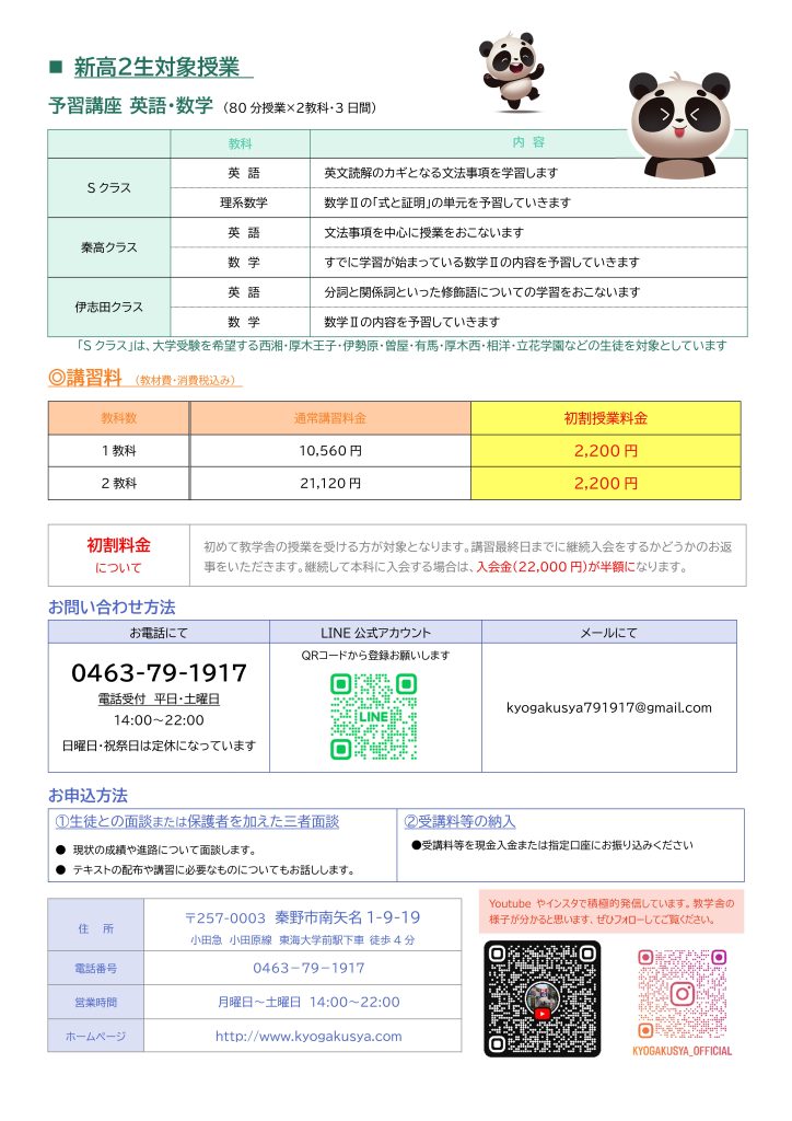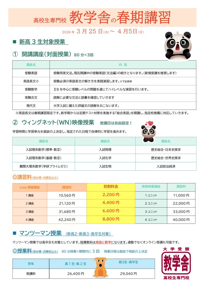 | 初割料金 | 初めて教学舎の授業を受ける方が対象となります。講習最終日までに継続入会をするかどうかのお返事をいただきます。継続して本科に入会する場合は、入会金(22,000円)が半額になります。 |