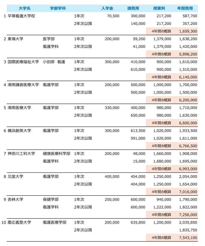 今回は看護系大学の学費の違いについて紹介します。紹介する学校は教学舎から近い10校です。