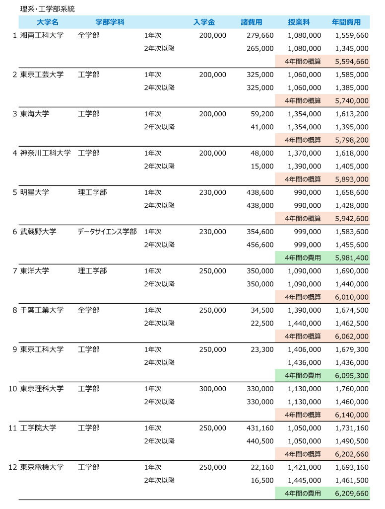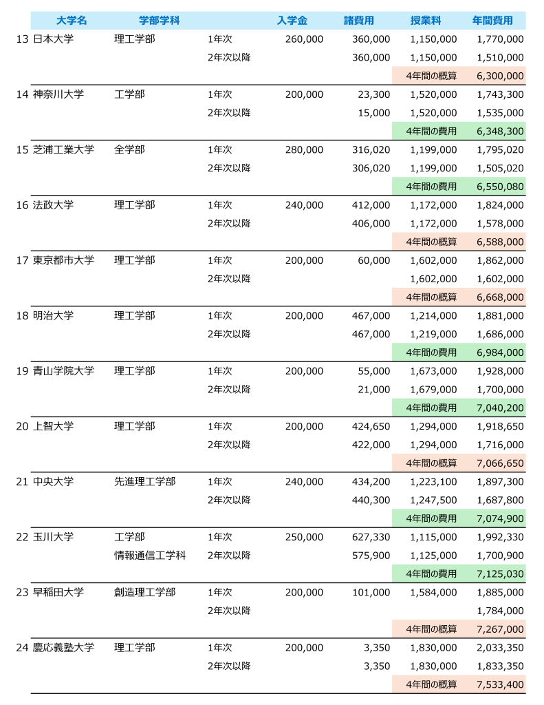 最後に取り上げたのは、理系学部(主に工学部)の学費になります。今回セレクトした大学は、首都圏にある大学から独断と偏見に24の大学選びました。また入学年度(初年度)だけでなく、卒業まで4年間の学費の概算でランキングを作りました。なおランキングは学費が安い順です。