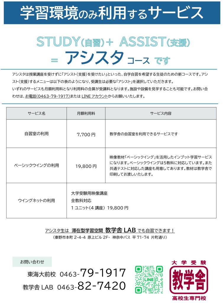 教学舎には、授業を受けずに自習室のみを利用できる、自習室プラン『アシスタコース』があります。
